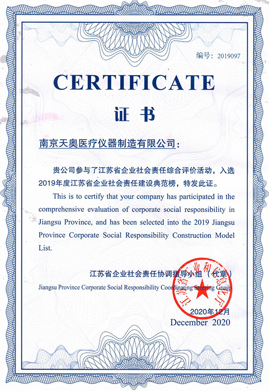 天奧入選2019年度江蘇省企業(yè)社會(huì)責(zé)任建設(shè)典范榜