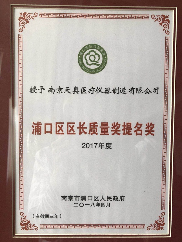 南京天奧醫(yī)療儀器制造有限公司榮獲“2017年浦口區(qū)區(qū)長質(zhì)量獎提名獎”和質(zhì)量強區(qū)工作區(qū)級“先進單位”稱號。